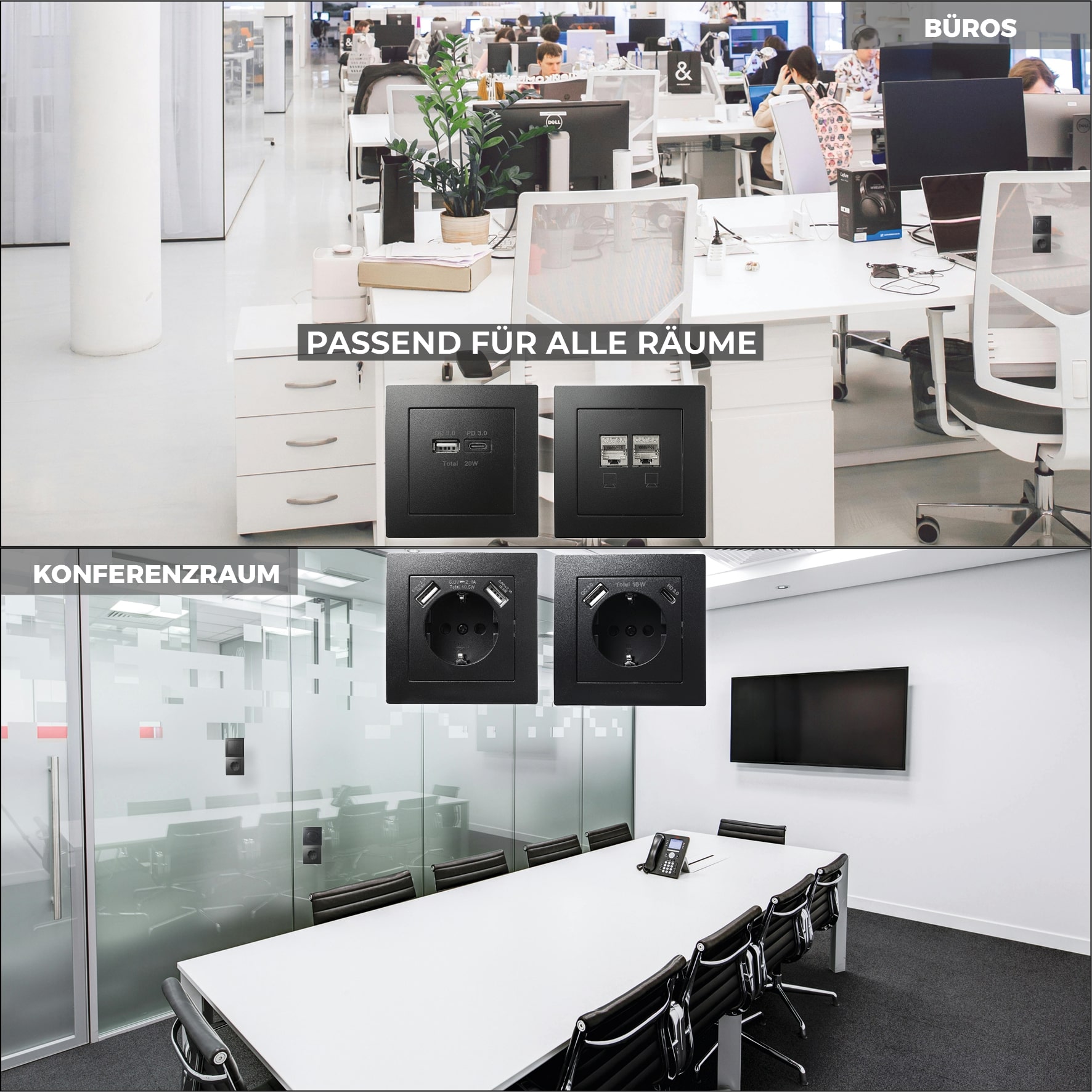 Die elegante schwarze Oberfläche fügt sich nahtlos in jede moderne Innenarchitektur ein. Ideal für den Einsatz zu Hause oder im Büro, um Ihren Raum funktional und stilvoll zu gestalten. Entworfen ohne Rahmen und mit den Maßen 80x80x40mm, passt sie perfekt in Standard-Hohlwanddosen.