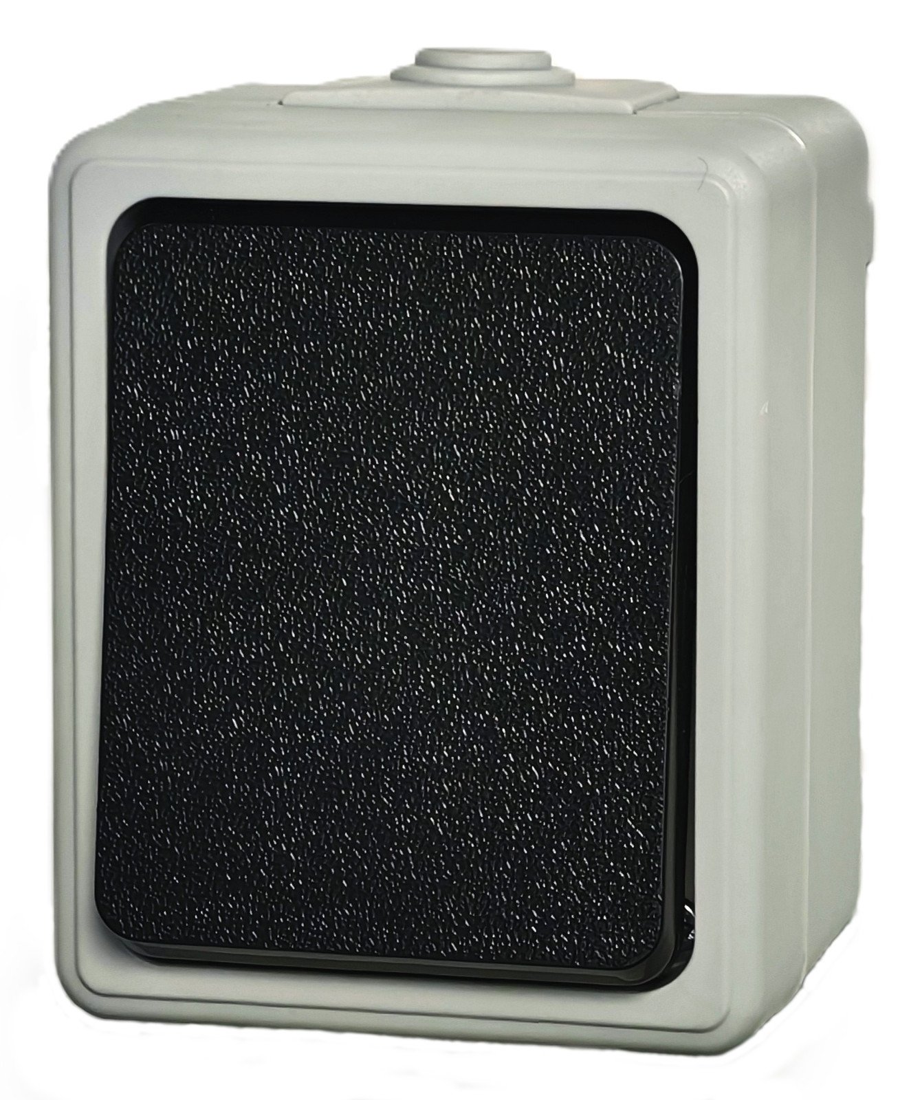 Aus/-Wechselschalter 1-fach mit schwarzem Schalter mit grauem Rahmen für Feuchträume nach IP44